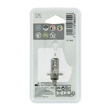 - Éclairage automobile : Ampoule moto H1 – 12 V – P14,5s – 55W – Feux de route – Feux de croisement – Feux antibrouillard – Michelin