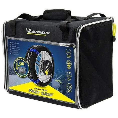 - Jeu de chaînes neige Michelin Fast Grip à montage frontal, tension et centrage automatique, homologuées panneau B26 du code la route.