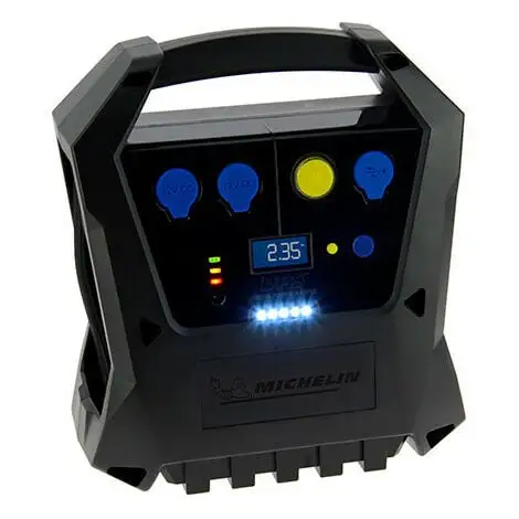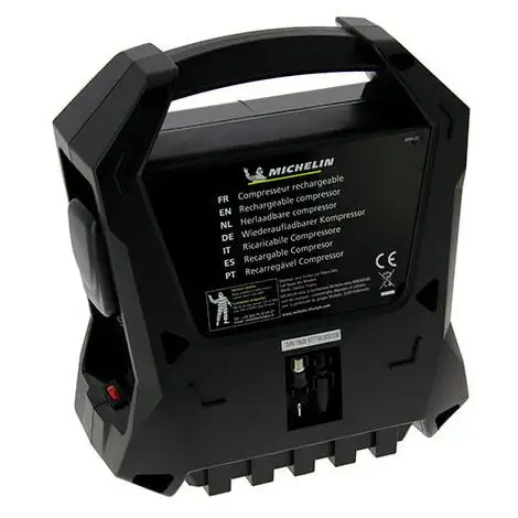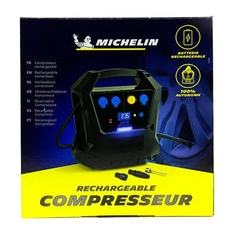 - Compresseur : Compresseur digital rechargeable 230 V – 120 W – 1,0 Ah – Michelin