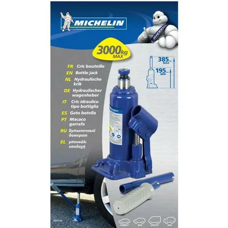 MICHELIN Cric bouteille 3T – Cric bouteille pour levage jusqu’a 3T. Ultra plat : Hauteur de levage : 195mm a 385 mm. Poignée de confort sur le levier. Semelle caoutchouc. Garantie : 1 an. Contact : 04.76.32.69.37 – [email protected]