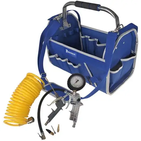 MICHELIN KIT GONFLAGE – Sacoche MICHELIN porte outils renforcée comprenant: un tuyau d’air – Une soufflette – Une poignée de gonflage – Embouts de gonflage, L’ensemble de ces accessoires sont en raccords rapides universel CE – Poids NET: 3kg